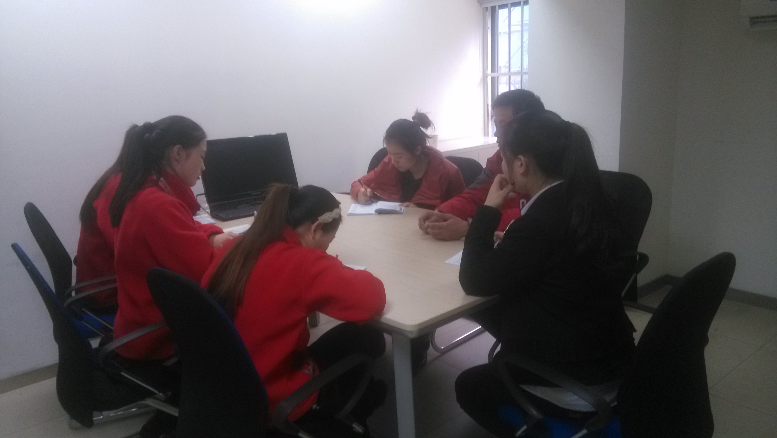 售后部陳經(jīng)理及客服主管在給客服專員講解不懂的售后問題