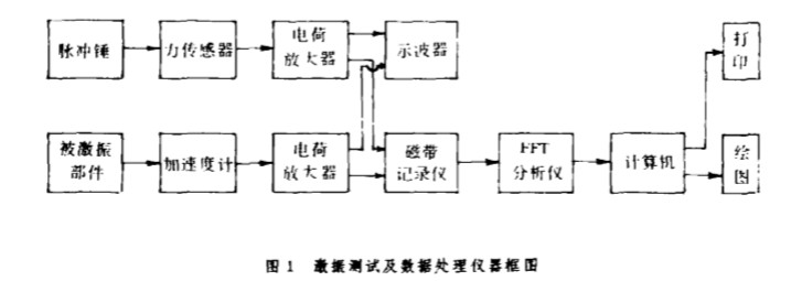 本試驗(yàn)采 用 四平鼓風(fēng)機(jī) 廠生產(chǎn)的 9 一28 一 1 4A 離心式通風(fēng) 機(jī) 進(jìn)行脈沖激振 , 從而進(jìn)行 譜分 析和模態(tài)分析 , 為尋找 誘發(fā)噪聲 , 識別噪聲源提供依據(jù) . 將風(fēng)機(jī)分成葉輪和機(jī)殼 兩部分分別進(jìn)行激振 , 且兩部分 均是 多點(diǎn)激振 , 一點(diǎn)拾 振. 試 驗(yàn)時 , 分別記錄 了脈沖力信號和 加速度 響應(yīng)信號 , 并 由 FFT 分 析儀和 計(jì)算機(jī)進(jìn) 行 信號分析 和數(shù)據(jù)處理 . 圖 l 是激振測試及數(shù)據(jù)處理儀器框圖.