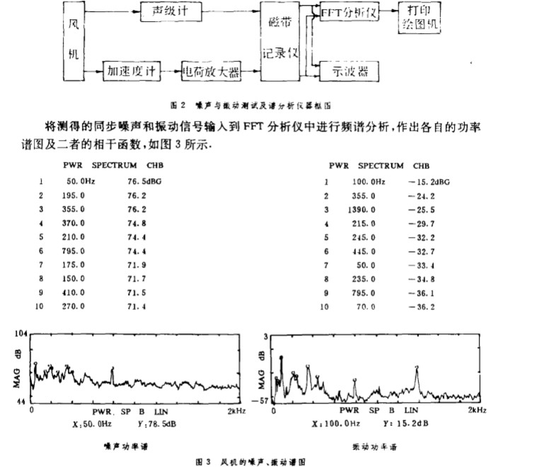在測試噪聲信號的 同時 , 又在機(jī)殼表面選一 點(diǎn)拾取 振動 信號 , 因 為在風(fēng)機(jī) 的兩個部件 中 , 機(jī) 殼振動最 顯 著. 這樣經(jīng) 過譜分析后 , 可以看出振動 對 噪聲影響大 小. 圖 2 是噪 聲與振動測 試及譜分析儀器框圖.