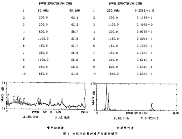 在測 量電機(jī) 噪聲信號 的 同時 , 為了說明 電機(jī) 的振動 對風(fēng)機(jī) 噪聲的影 響 , 又 測 量了同步 振 動信號 , 振動 響應(yīng)傳 感器 (加速度計(jì) )安裝在風(fēng) 機(jī)機(jī)架上. 圖 4 是 電機(jī)空運(yùn) 轉(zhuǎn)時 的噪聲